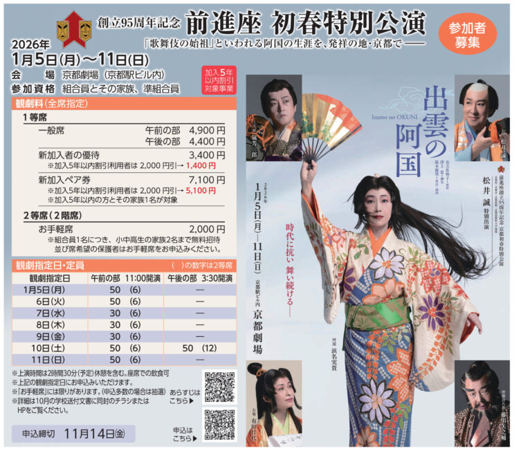 拡大して見る 日時 2026年1月5日(月)~11日(日) 午前の部 11:00開演 午後の部 3:30開演 場所 京都劇場(京都駅ビル内) 参加資格 組合員とその家族・準組合員 募集人数 上記参照 参加費 上記参照 申込締切 11月14日(金) 申込フォーム