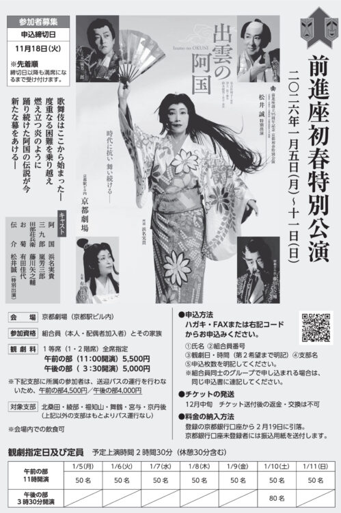 拡大して見る 日時 2026年1月5日(月)~11日(日) 場所 京都劇場(京都駅ビル内) 参加資格 組合員(本人・配偶者加入者)とその家族 参加費 1等席(1・2階席) 午前の部(11:00開演)5,500円 午後の部(15:30開演)5,000円 ※ (北桑田・綾部・福知山・舞鶴・宮与・京丹後)支部に所属の参加者は、送迎バスの運行を行わないため、午前の部4,500円/午後の部4,000円 申込締切 11月18日(火) 申込フォーム