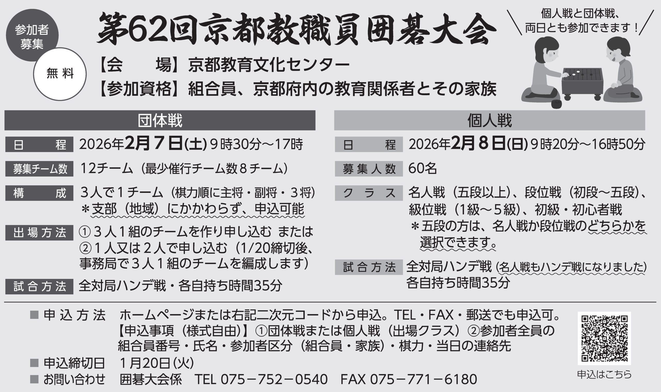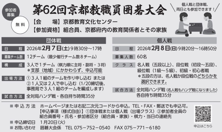 拡大して見る 日時 団体戦 2月7日(土) 9:30~17:00 募集チーム数 12チーム(最少催行チーム数8チーム) 個人戦 2月8日(日) 9:20~16:50 定員60名 場所 京都教育文化センター 参加資格 組合員、京都府内の教育関係者とその家族 参加費 無料 申込締切 1月20日(火) 申込フォーム